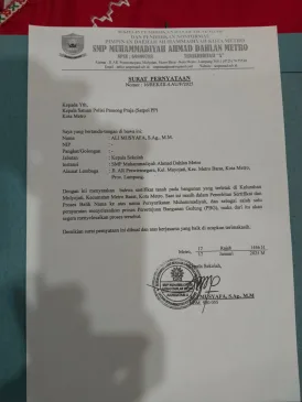 Kepala Sekolah SMP MUAD Kota Metro, Ali Musyafa mengatakan surat pernyataan siap melengkapi dokumen perizinan PBG itu dibuat pada 17 Januari 2025 lalu.
